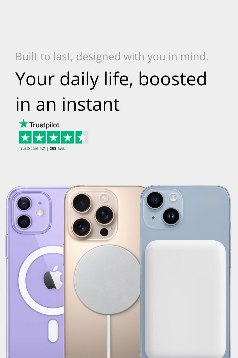 Simplifie ton quotidien avec nos accessoires magnétiques : coque, chargeur etbatterie externe MAGSAFE, conçus pour une utilisation rapide, pratique et 100 % sans fil ⚡